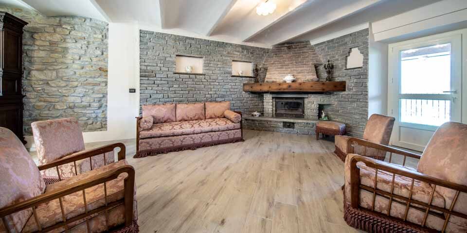 From the large car park at the back of the house, the front door leads to the reception area. The day area on the ground floor, accessible to all guests, comprises a large living room - with an open fireplace and access to a roofed terrace - a kitchen with a pizza oven, a gym with a bathroom, a storage room and a guest WC.