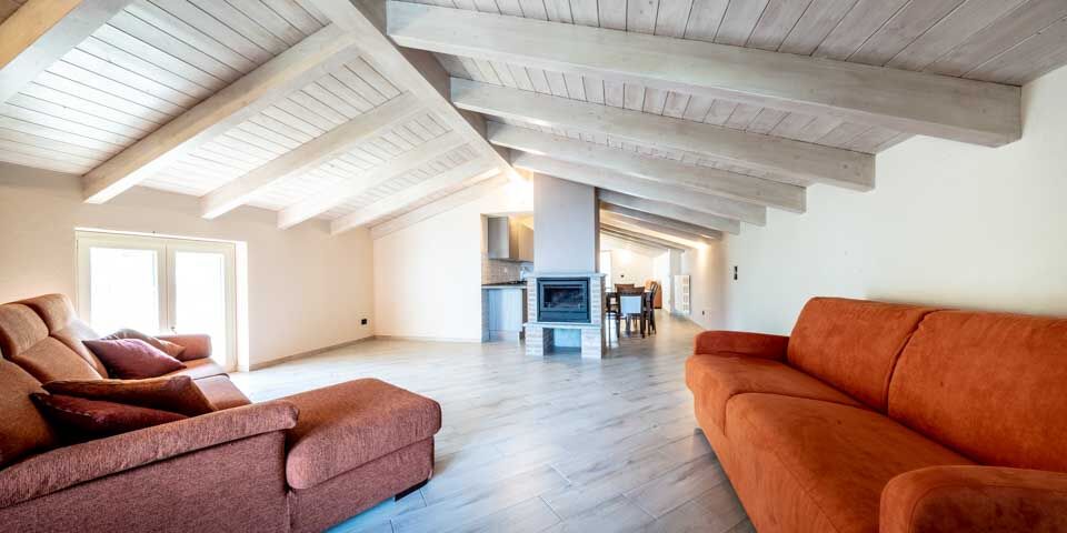 The bright exposed supporting beams under the well-insulated roof give the rooms of the penthouse apartment tons of character.